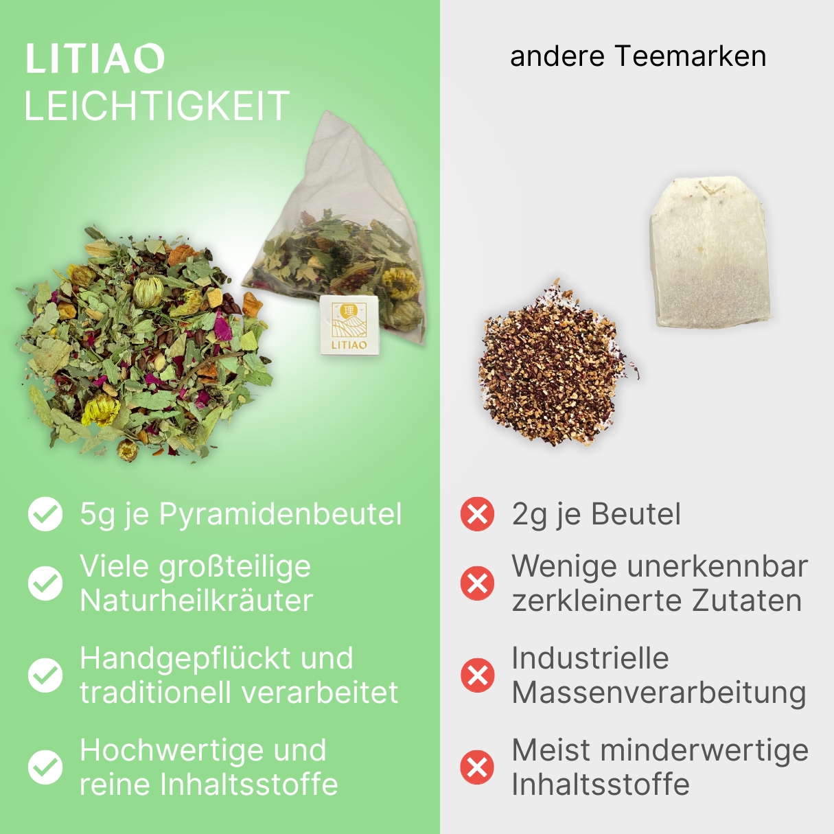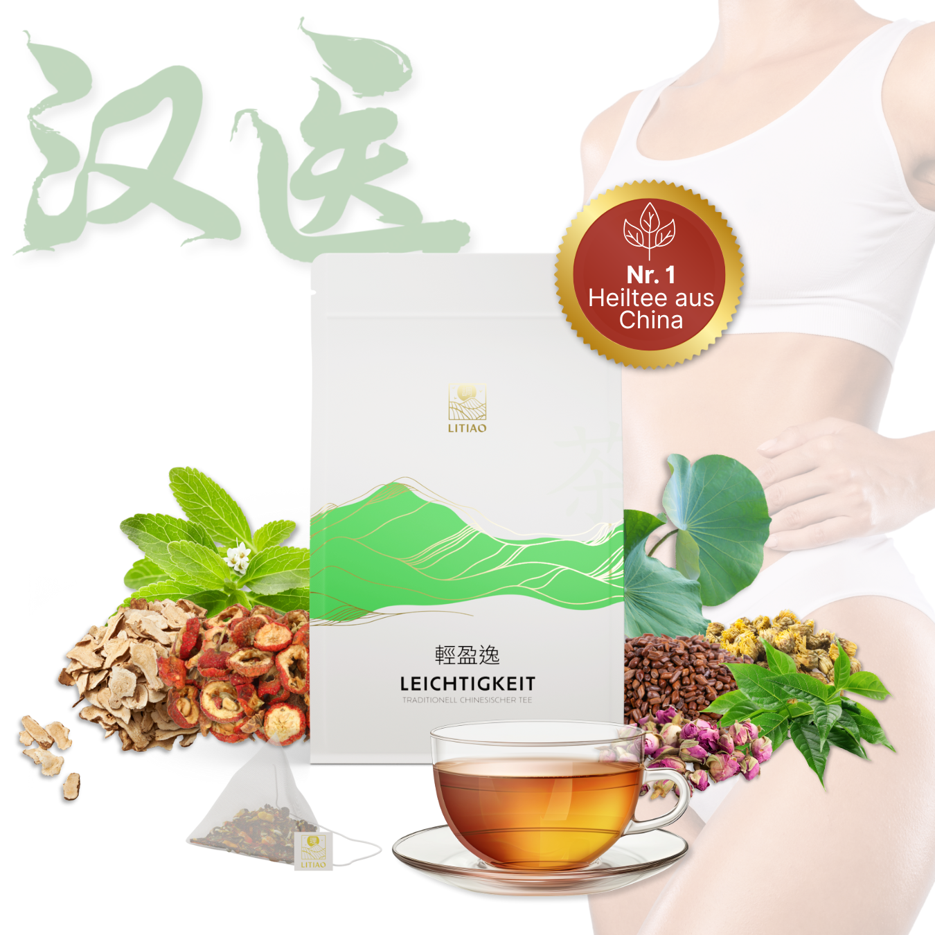 Die Lösung kommt aus der traditionellen chinesischen Medizin (TCM): LITIAO LEICHTIGKEIT ist ein speziell komponierter TCM-Kräutertee, der den Körper beim Abnehmen ganzheitlich unterstützt. Die 8 ausgewählten Zutaten wirken im Zusammenspiel auf mehrere Weise: Sie zügeln den Appetit, beschleunigen die Fettverbrennung und fördern die Verdauung sowie Entgiftung – ganz ohne chemische Zusätze.