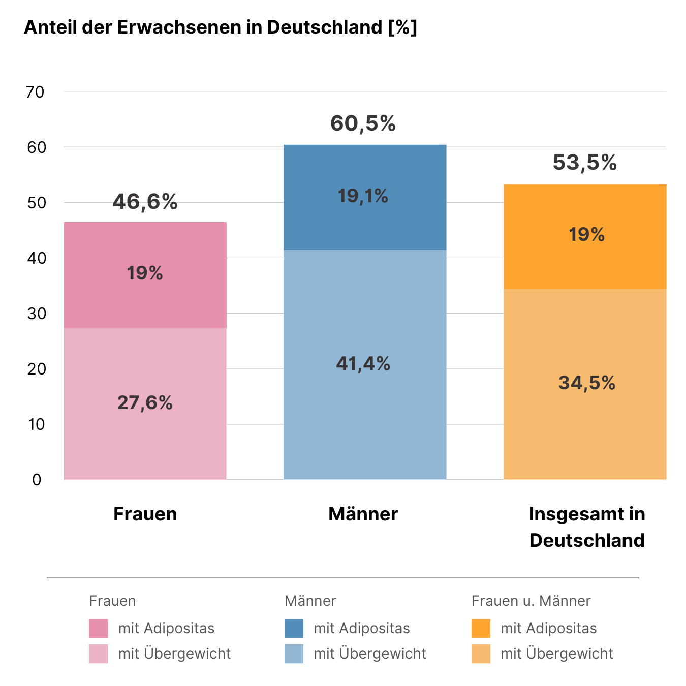 Das Robert Koch Institut zeigte in seiner Studie auf, dass in Deutschland 46,6% der Frauen und 60,5% der Männer von Übergewicht (einschließlich Adipositas) betroffen sind. Fast jeder 5te Erwachsene (19%) weist eine Adipositas auf.
